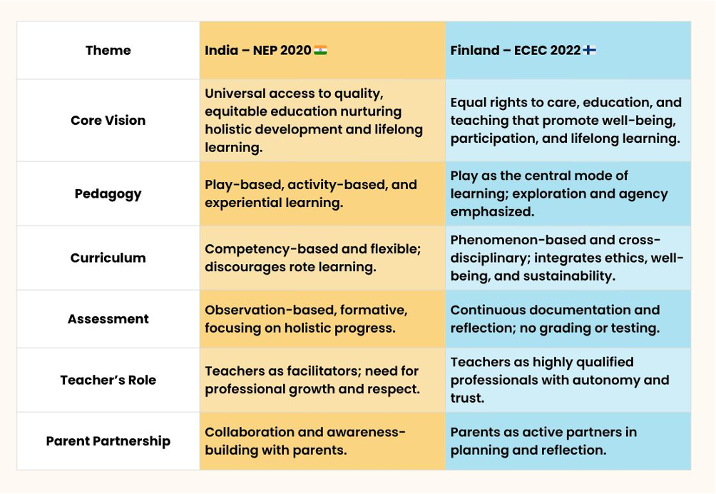 Both NEP 2020 and Finland's ECEC 2022 place playful, holistic learning and teacher empowerment at the heart of quality education.